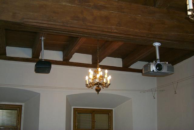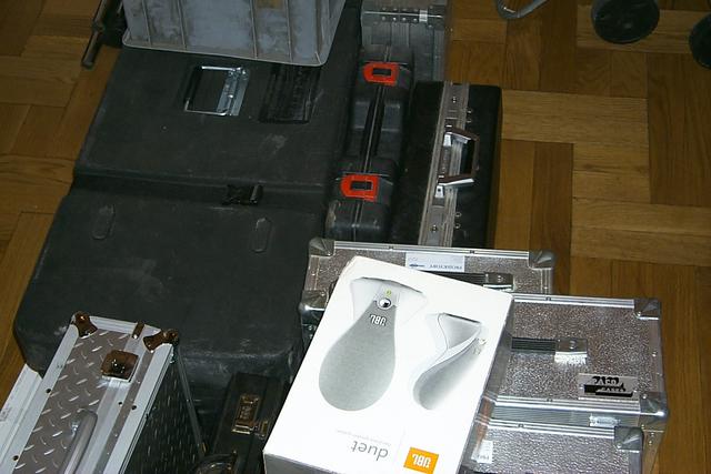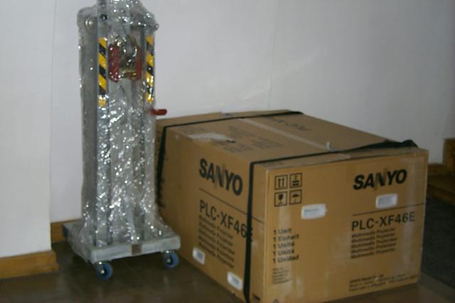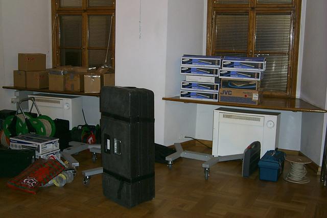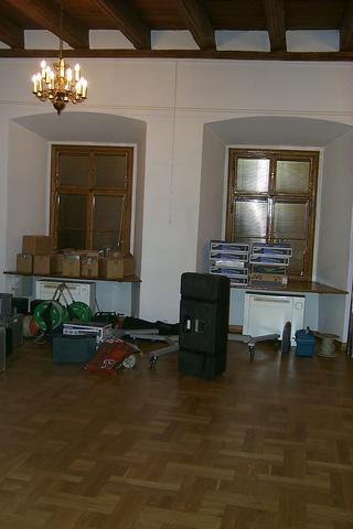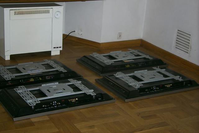 Zdjęcia przedstawiają fazę montażu urządzeń do wyświetlania wideo-artu
