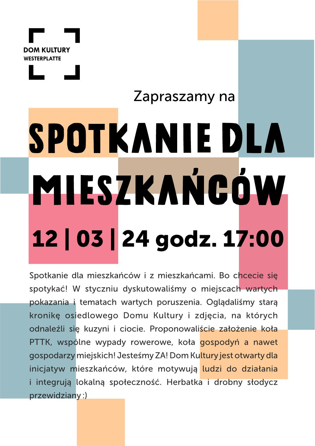 Spotkanie dla mieszkańców i z mieszkańcami jest, bo chcecie się spotykać! W styczniu dyskutowaliśmy o miejscach wartych pokazania i tematach wartych poruszenia. Oglądaliśmy starą kronikę osiedlowego domu kultury i zdjęcia, na których odnaleźli się kuzyni i ciocie. Zaoferowaliście pomoc w przygotowaniu mini warzywnika i zielnika przy Dom.Ku. Proponowaliście założenie koła PTTK, wspólne wypady rowerowe, koła gospodyń, a nawet gospodarzy miejskich! Jesteśmy ZA! Dom Kultury jest otwarty dla inicjatyw mieszkańców, które motywują ludzi do działania i integrują lokalną społeczność.
