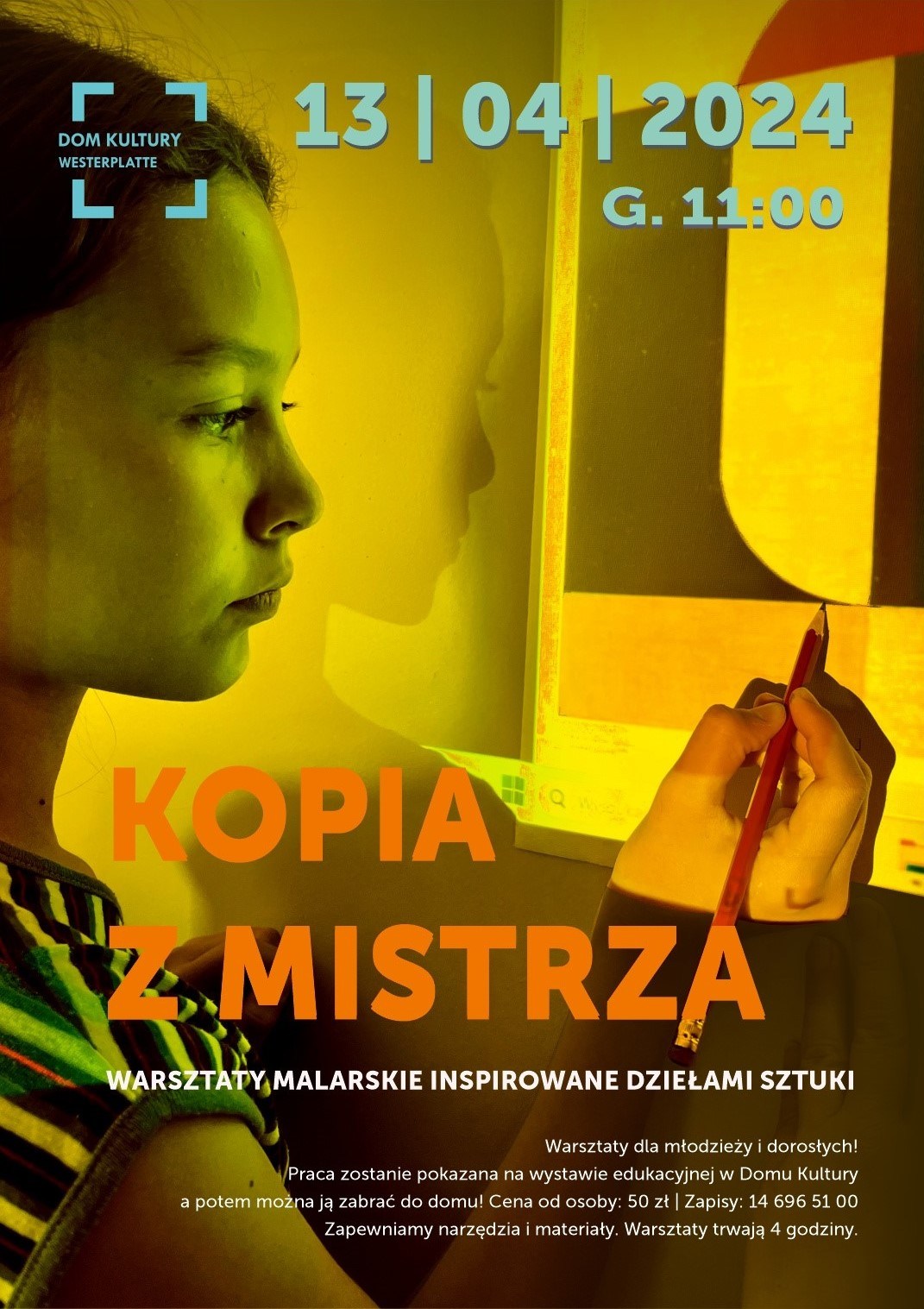 Chcesz na chwilę wejść w skórę słynnych artystek i artystów? Poczuć dreszczyk ekscytacji badając detale wybranego dzieła sztuki, aby go jak najwierniej namalować? Młodzież i dorosłych zapraszamy na warsztaty, podczas wykonamy jak najwierniejsze reprodukcje obrazów sztuki współczesnej. Każdy wybierze obraz dla siebie z przygotowanych albumów i wydruków. Będziemy mieszać farby, by uzyskać kolory najbliższe oryginałów, wykorzystamy technikę rzutowania i szablonu by zachować kompozycję i precyzję linii. Wykonane reprodukcje zostaną zaprezentowane w Dom.Ku podczas wystawy edukacyjnej „Kopia z mistrza”. Po wystawie będzie można zabrać wykonane reprodukcje do domu. Warsztaty poprowadzi Dorota Omylska.
